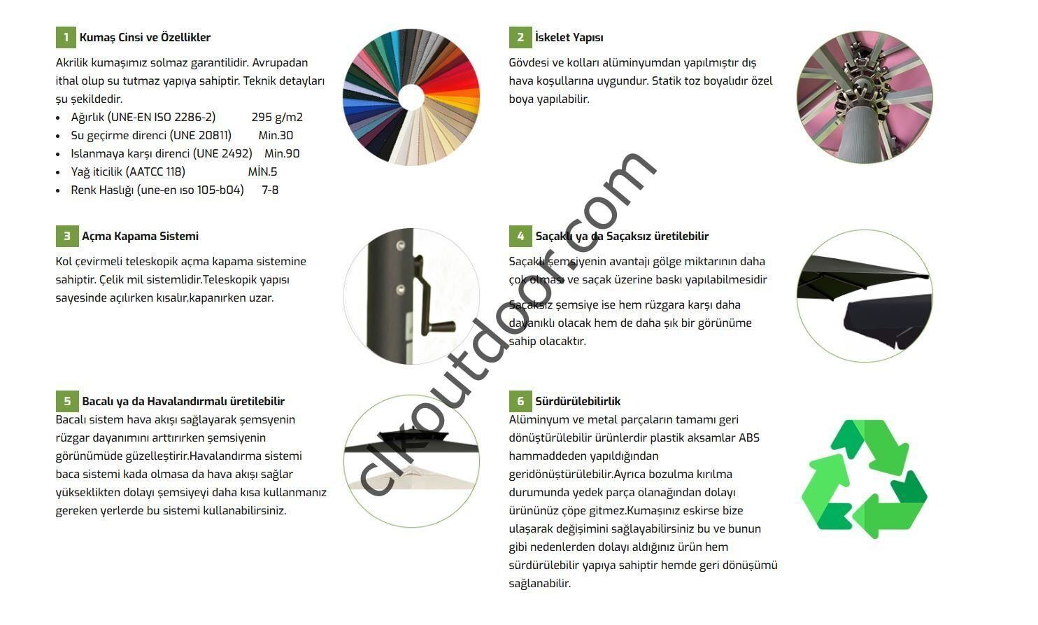 CLK 3,5x3,5 metre Mega Şemsiye tamamen alüminyum ve çelikten üretilen Mega İpli Sistem Şemsiyeler, işlevsel ipli çalışma sistemi, farklı ölçü ve renk seçenekleri, zengin tamamlayıcı ve sabitleyici aksesuar seçenekleri ile her mevsimde yaşam alanlarınızı konforla buluşturuyor.