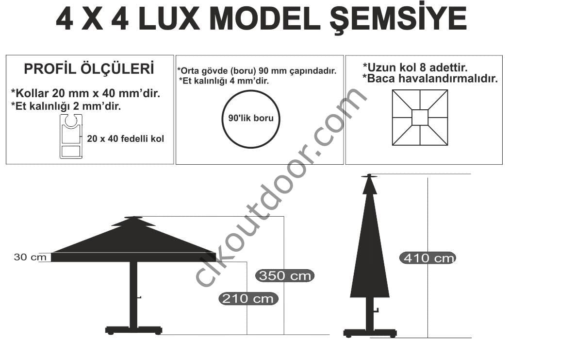 CLK 4x4 mt Teleskopik Mekanizmalı Kare LUX Bahçe Şemsiyesi